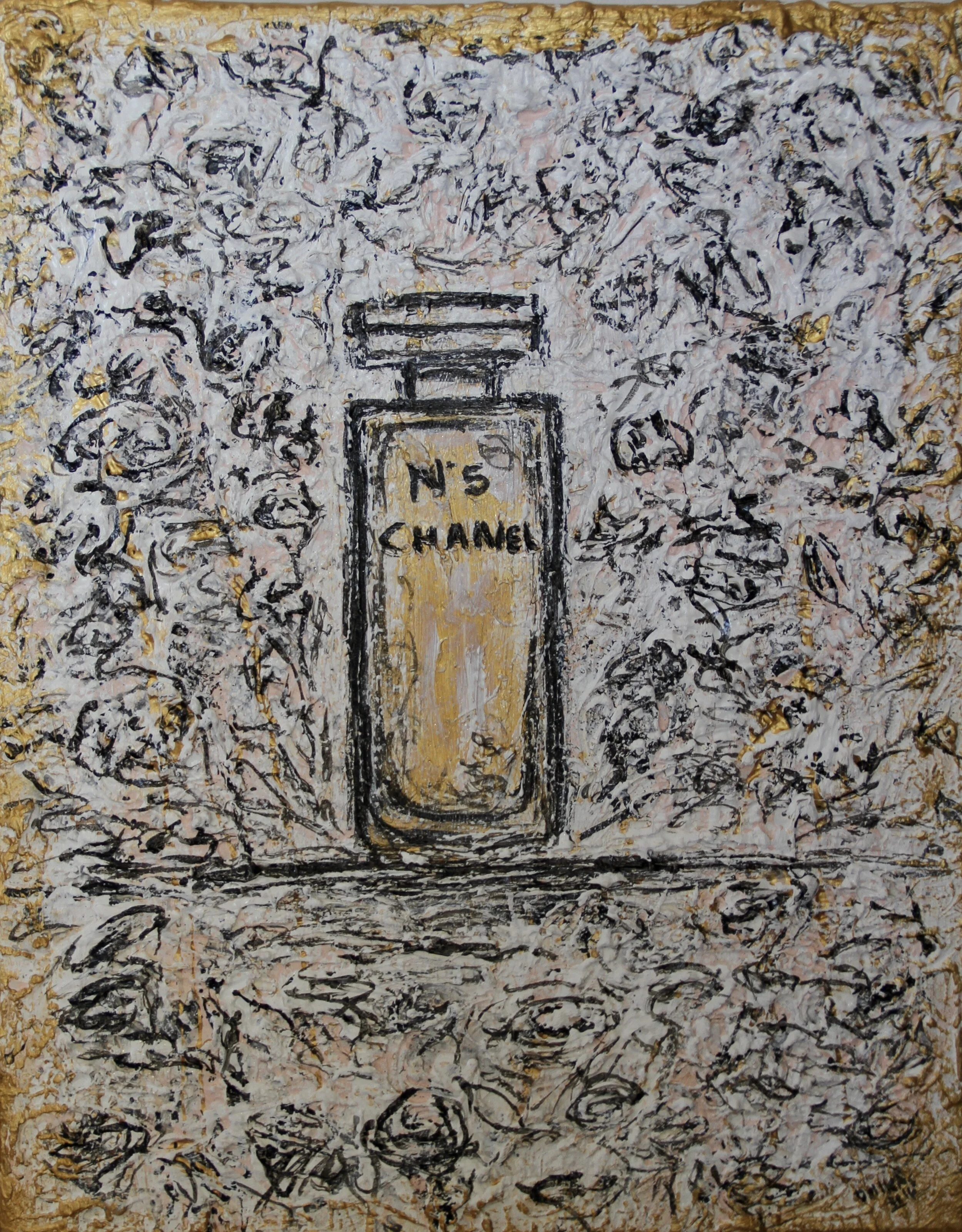 Chanel Bottle 5 9"x12" Mix Media on Wood
